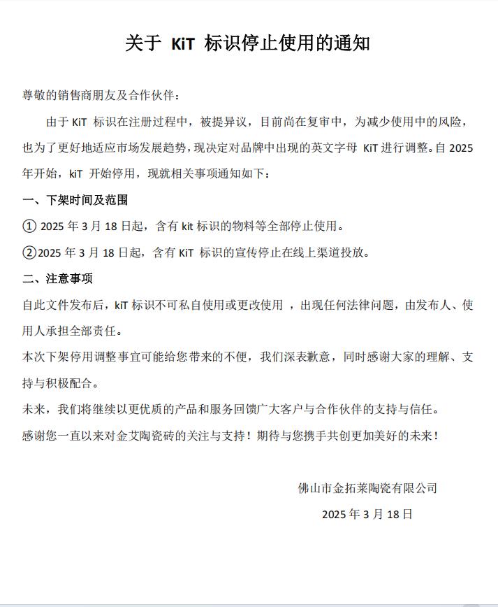 關于KIT標識停止使用的通知——關于KIT標識停止使用的通知